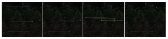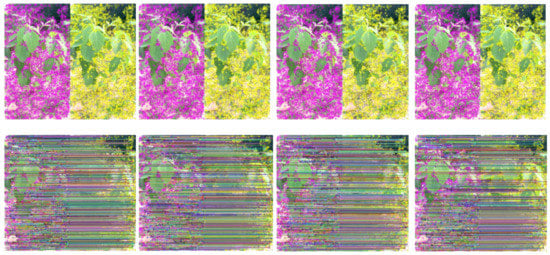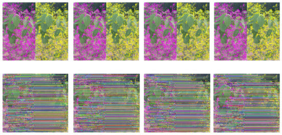 where represents the repeatability rate, represents the number of repeated points, and represent the graph and graph to be matched in the same scene, respectively, and and represent the number of feature points detected in and , respectively. Considering that there must be a non-overlapping range between the two graphs, the coordinates of the feature points in are mapped to the coordinate system through the homography matrix, and the coordinates beyond the range of the coordinate system are removed. The number of is updated, and then, the number of is updated by doing the same operation on .