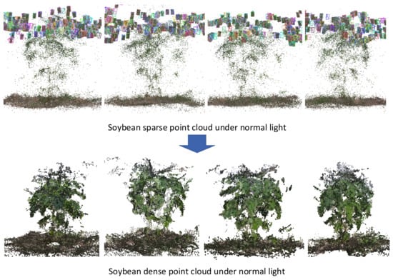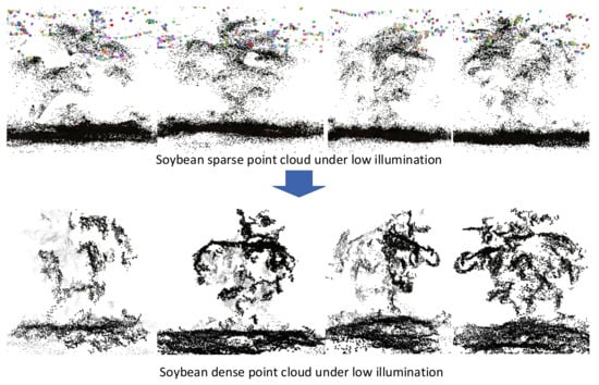 The experiment conducted the reconstruction of the sparse point cloud model of the same soybean plant and the dense point cloud model of its corresponding view under normal light conditions, as shown in Figure 12. The soybean sparse point cloud model reconstructed under normal light at the top of the figure can be clearly observed. The rebuilt soybean sparse point cloud model under light can easily see the general outline and growth structure of soybean plants. The model with the dense point cloud of the soybean plant under normal light in the lower part of the figure simulates a model similar to the actual soybean plant in appearance. Additionally, compared with the soybean plant model reconstructed under low illumination, it is obvious that the structure and color of the soybean appearances are diverse, the rich texture surface is also clearly visible, and the characteristics of the soybean plant leaves can be observed in detail.