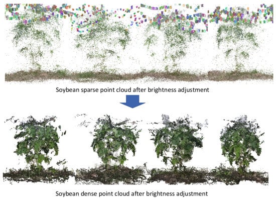 The illumination environment of the collected soybean plant images is adjusted to generate a sparse point cloud based on the paired matched feature points of the soybean plant, and the dense three-dimensional point cloud of the soybean plant is recovered by surface slicing, as shown in Figure 13, where the sparse point cloud model reconstructed from the same soybean plant after enhancement and the dense point cloud model from the corresponding perspective are shown. For the sparse point cloud model reconstructed from the multi-view image, due to the increase in the number of feature points that are adjusted for the detection of light brightness and correctly matched, the light-adjusted soybean sparse point cloud reconstructed from the top of the figure is almost the same as the sparse point cloud of soybean plants under normal light, and the contour of the soybean plants can also be observed, and the general characteristics of soybean plants can be seen. The model of the soybean plants with dense point clouds at the bottom of the figure is, in appearance, also very close to the actual soybean plant. In addition, the reconstructed soybean plant model is similar to the soybean plant reconstructed under normal lighting conditions in appearance. It also has a complex and detailed structure, various colors, and rich texture surface. However, it is difficult to extract information from the image under low illumination. The acquired multi-view soybean plant image is subject to light adjustment, which can reduce the noise information of the image to a certain extent. The contour structure, feature points, and boundary information of the soybean plants in the image are more prominent. The distinct three-dimensional model of soybean plant structure information reconstruction makes the differences between the reconstructed soybean plant model and the model reconstructed under normal light small and realizes the perception of soybean plant growth in a low-light environment.