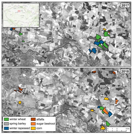 Eight in situ sampling campaigns were organized during the 2017 (3 campaigns) and 2018 (5 campaigns) growing seasons in the lowlands of the Central Bohemia Region known as Polabí (Elbeland). This is one of the most fertile and productive areas in the Czech Republic, with an average annual temperature of 8–9 °C and average annual precipitation of 500–600 mm. The in situ data were used for (1) parameterization of the PROSAIL radiative transfer model, and (2) validation of crop biophysical variables retrieval. The timing of the campaigns was chosen to cover critical phenophases of the crops. In situ work was carried out on 18 plots (188 reference points) in 2017 and 21 plots (244 reference points) in 2018 at cooperating farms located in the Central Bohemia Region (see Figure 1). The spatial distribution of the sampling transects was defined to capture maximum variability in crop conditions using the Normalized Difference Vegetation Index (NDVI) layer extracted from the nearest cloud-free Sentinel-2 or Landsat scene available prior to the planned campaign. Typically, a transect of 10 points at each plot with 40 m spacing was set up.