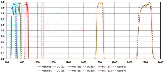 Spectral response functions of Sentinel-2 MSI and Landsat OLI common bands.
