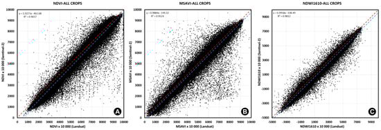 Scatter plots of spectral vegetation indices derived from Sentinel-2 MSI and Landsat OLI and calculated for agricultural crops of interest during the period 2017–2020 across the entire Czech Republic: NDVI (A); MSAVI (B); and NDWI_1610 (C).
