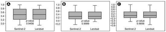 Box plots of S2 and LS harmonized VI datasets: NDVI (A); MSAVI (B); and NDWI (C).