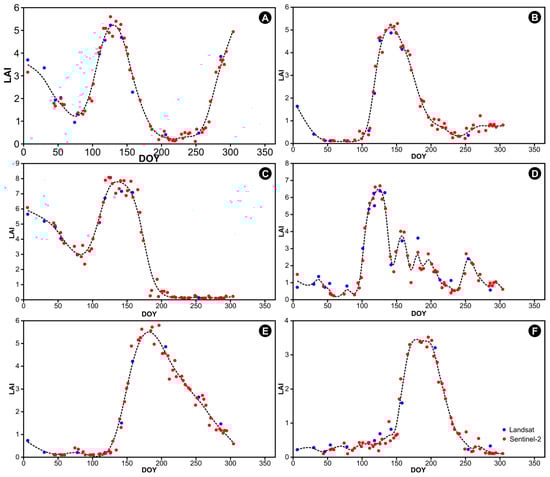 Example of harmonized LAI time series from Sentinel-2 MSI and Landsat OLI data acquired during 2018 for winter wheat (A); spring barley (B); winter rapeseed (C); alfalfa (D); sugar beetroot (E); and corn (F).