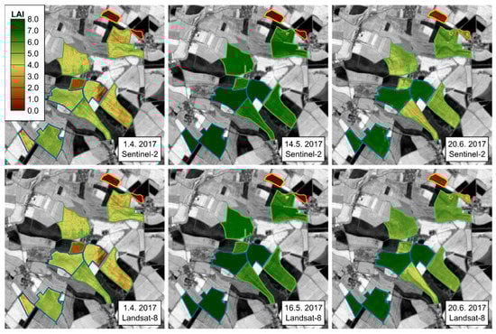 To demonstrate the spatial consistency of the LAI layers derived from Sentinel-2 and Landsat data, three image pairs from 2017 (Sentinel-2 and Landsat 8) were selected. In two cases, the images from both sensors were acquired on the same day (1 April and 20 June 2017). In one case, the delay between acquisitions from each sensor was 2 days (14 May 2017 for Sentinel-2 and 16 May 2017 for Landsat 8. The derived LAI layers are shown in Figure 6. Across all the dates shown, a strong agreement in the spatial patterns of LAI, either at the individual plot level or when comparing several plots with different vegetation conditions, can be observed.