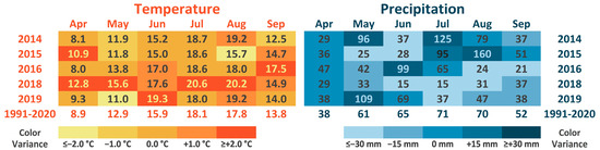 Mean monthly and overall mean temperature (°C) and deviation from mean total monthly pre-cipitation (mm) of the experimental years, compared with long-term (1990–2020) mean temper-ature and mean total monthly precipitation.