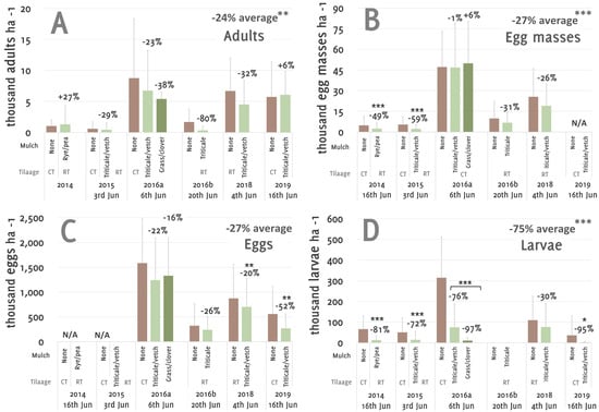 In the vast majority of experiments, transferred mulch from green manures reduced the initial infestation by between 23 and 80% (Figure 2A), but this was not significant, despite high standard deviations. Over all the experiments, the initial infestation was significantly reduced by 24% (p < 0.001). The resulting egg masses (Figure 2B) and the number of eggs (Figure 2C) were also reduced in many cases. In 2014 and 2019, where immigrating adults were increased (+27% and +6%), the number of egg masses in 2014 and the number of eggs in 2019 were nevertheless significantly reduced by 49% and 52%, respectively (Figure 2A–C). Overall, while the reductions in immigrating adults, egg masses and eggs in mulched plots were not always statistically significant (Figure 2A–C), in all experiments the number of larvae were reduced significantly (Figure 2D).
