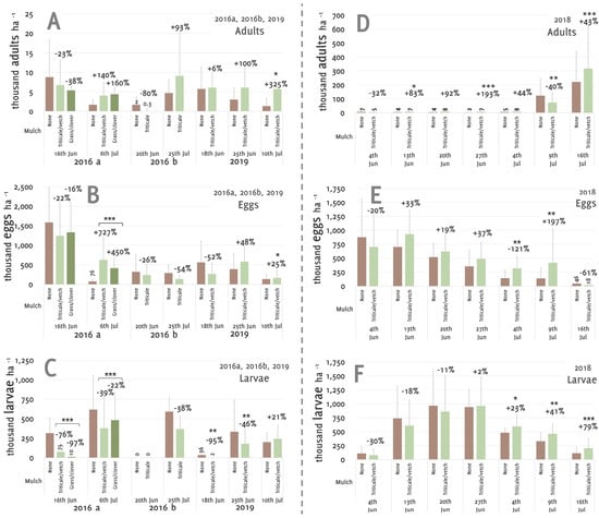 Effect of various mulch materials on different developmental stages (A–C for 2016a, 2016b, 2019 and D–F for 2018) of CPB in the different experiment over the vegetation period. Relative numbers (%) show the differences between the mulched and unmulched control. Lines above the bars indicate the standard deviation in the positive direction. Statistical differences are indicated by * (p < 0.05), ** (p < 0.001) and *** (p < 0.0001). Observe that the y-axes are scaled differently for 2018 compared to the other years.