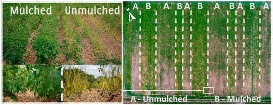 Comparison of unmulched and triticale-vetch mulched potatoes on 9 July 2018. Left: Skeletonized leaf damage in unmulched potatoes before flowering. Right: Initial infestation started in the south-west exposed plots resulting in a distinct gradient from the edge of the field (Figure modified according to [9]).