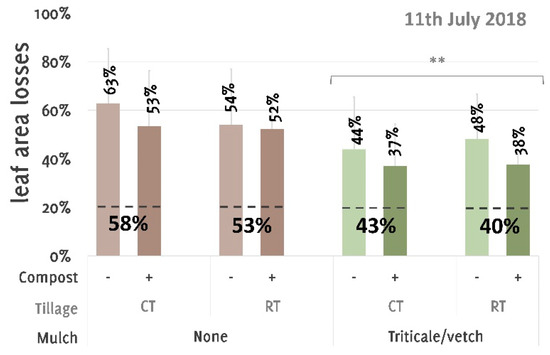 Leaf area losses of the 2018 trial on 9 July in the treatments with (+) and without (−) compost under conventional (CT) and reduced (RT) tillage as well as unmulched (none) and mulched (triticale/vegetation). Relative numbers below the dashed lines indicate mean values of the marked variants. Lines above the bars indicate the standard deviation in positive direction. Statistical differences (LME) are marked with ** (p < 0.001).