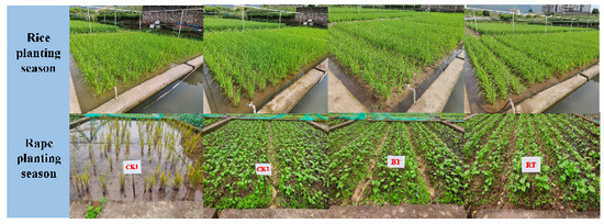 This study was conducted in the test field of the national monitoring station of soil fertility and fertilizer efficiency, on purple soils (30°26′ N, 106°26′ E; 230 m altitude), for two years (August 2019–December 2021). The soil was neutral purple paddy soil (anthrosols in the World Reference Base Taxonomy) [27] developed on the parent material of purple sandy mudstone of the Shaximiao Formation of the Middle Jurassic (J2s), which contains a lot of mineral nutrients. This area is characterized by a subtropical monsoon humid climate, with abundant rainfall mostly from May to September. The annual average precipitation is 1105.40 mm, the annual average air temperature is 18.30 °C, the annual average sunshine time is 1276.70 h, and the annual frost-free period is 334 days. The actual plots in the rice and rape seasons are shown in Figure 1.
