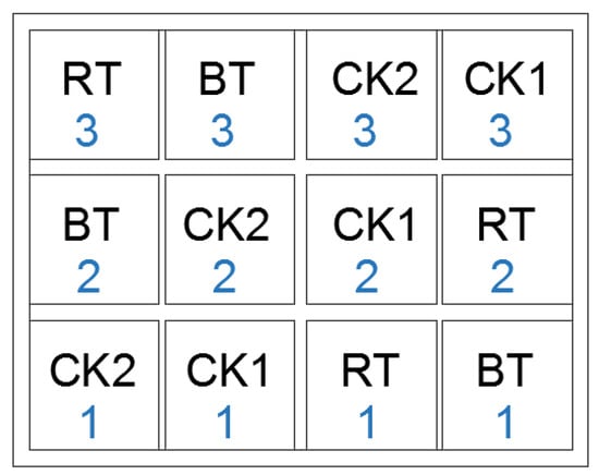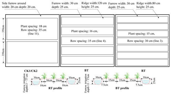 The schematic diagram of different treatments is shown in Figure 2. The field plot experiment that was conducted to study the mechanized ridge tillage with rice-rape rotation involved four tillage treatments: (1) conventional tillage with rice and winter fallow (CK1), one season medium rice, year-round flooding, and direct seeding of rice; (2) conventional tillage with rice-rape rotation (CK2), with a box surface of 350 cm and a height difference of no more than 3 cm; (3) wide-ridge tillage with rice-rape rotation (BT) and mechanical ridging, 120 and 30 cm wide ridges and a 25 cm deep furrow; and (4) narrow-ridge tillage with rice-rape rotation (RT), mechanical ridging, 80 and 30 cm wide ridges and 25 cm deep furrow. The furrows of BT and RT were flooded to a depth of 10–15 cm in the rice planting season. As shown in Figure 2, this study was conducted in experimental plots with an area of 64 m2 (8 m × 8 m). There were 12 experimental plots with four different farming treatments. Each treatment was replicated three times. Information about the experimental plots, experimental design management, and mechanical information are shown in Figure 3 and Figure 4 and Table 1. For direct seeding of rape and rice, Chuanhuayou 320 was selected for rice, while 120 kg of pure nitrogen, 90 kg of phosphorus fertilizer, and 75 kg of potassium fertilizer were applied per hectare. Nitrogen fertilizer was applied according to the ratio of base fertilizer: topdressing (jointing stage) = 6:4. Phosphorus and potassium fertilizer were applied once; the variety of rape was Dezayou No. 5, while 180 kg of nitrogen fertilizer, 105 kg of phosphorus fertilizer, and 90 kg of potassium fertilizer were applied per hectare. The nitrogen fertilizer was applied according to the ratio of base fertilizer: topdressing (the stage with 3–4 leaves) = 6:4. The phosphorus and potassium fertilizers were applied once, and 15 kg of borax were applied per hectare in the early flowering stage. Grass removal was once a month. The field plot experiment was carried out for two years.