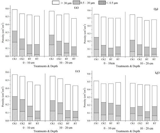 Soil porosity is an important component of soil structure. Differences in soil porosities and pore distributions affect the water storage and infiltration of the soil [24,25]. Pores can be divided into small, medium, and large pores. Pore diameters < 0.5 μm represent small pores (i.e., residual and bound pores), which usually inhibit some microbial activities and activation reactions, but also maintain and transport water and nutrients in the soil; pore diameters between 0.5 and 30 μm represent mesopores (i.e., storage pores), which are generally suitable for the development of crop roots and the preservation of the effective water required for root growth; pore diameters > 30 μm represent macropores (i.e., exchange pores), which are conducive to the exchange of air between the atmosphere and the soil, ventilate the soil, and facilitate the infiltration of water and rapid drainage [24,26].