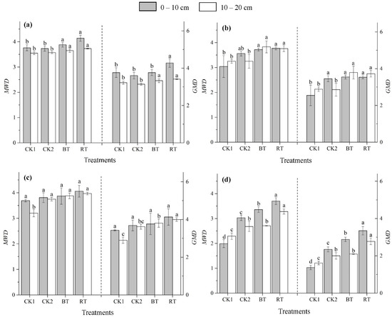 The MWD and GMD at the (a) flowering stage, (b) maturity stage of rape, (c) heading stage, and (d) maturity stage of rice under different tillage modes. Different lowercase letters in the same line represent significant differences between treatments (p < 0.05).