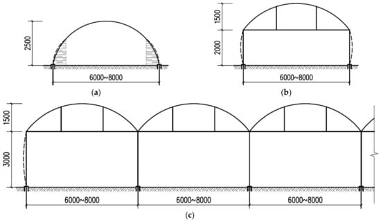 Evolution of the round-arch greenhouse structure (unit: mm). (a). Floor-type round-arch greenhouse structure; (b). Upright side wall type single arch greenhouse structure; (c). Multi-span round-arch greenhouse structure.