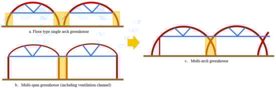 The arch bar of the floor-type round-arch greenhouse structure (Figure 1a) has a good mechanical performance and an easy-to-install structure [11]. However, there are also problems such as the difficulties in using and operating the area below shoulder height in the greenhouse or between greenhouses. Thus, an upright side wall type single arch greenhouse structure (Figure 1b) was developed during real production. This structure solves the problem of shoulder space use. To further improve the land use and make full use of structural materials, a multi-span round-arch greenhouse structure (Figure 1c) was developed [12,13,14,15]. This structure is spacious and has a high land use rate, which is being gradually developed into a major structural form of the current multi-span plastic greenhouse [16].