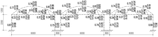 Stress ratios of structural calculation (unit: mm). Notes: The number on the left of each component is the strength stress ratio, that on the upper right is the in-plane stability stress ratio, and that on the lower right is the out-of-plane stability stress ratio.
