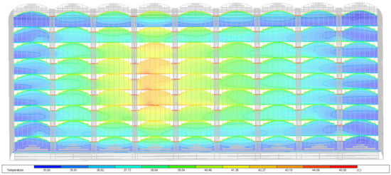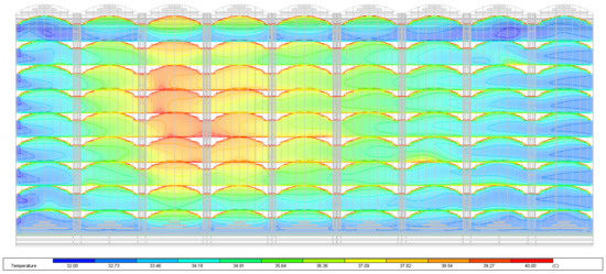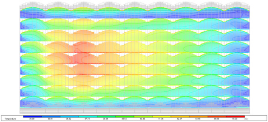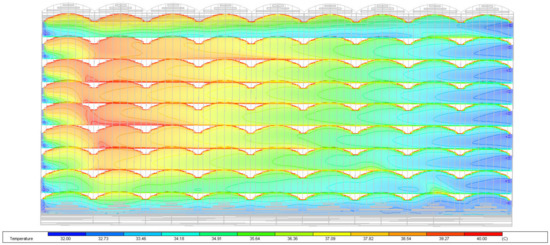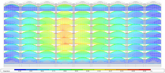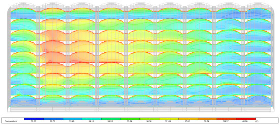 Figure 11, Figure 12 and Figure 13 show the simulated temperature clouds inside the greenhouse at 15:00 on 12 July, when the wind speed was 0. The inlet temperature of the simulated environment was 35 °C. The cloud map takes the midline of each row of arch bars to make temperature slices. The slices are located 2 m away from the front and rear rows of the arch bars.