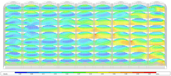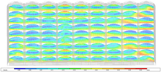 Figure 14, Figure 15 and Figure 16 show the simulated temperature clouds inside the greenhouse at 13:00 on 8 July, when the outdoor wind speed was 1 m/s (windy hours around noon) and the inlet temperature of the simulated environment was 32.7 °C. The cloud map takes the midline of each row of arch bars to make temperature slices. The slices are located 2 m away from the front and rear rows of arch bars.