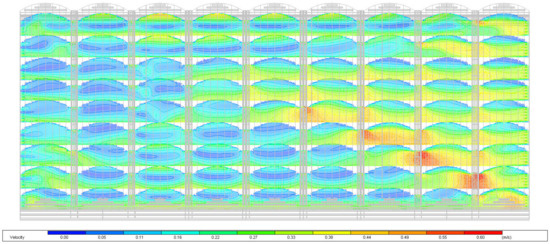 Wind speed cloud map of the crossed multi-arch greenhouse (outdoor wind speed 0 m/s).