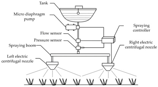 In order to study the influence of different operating parameters on spraying quality, a spraying system for UAV spraying application was designed as shown in Figure 1. The spraying system is mainly composed of a tank, a micro diaphragm pump (MDP) (PLD-1206, max pressure: 1 MPa, max flow: 4 L/min), a pressure sensor (KY-3, measure range: 0–1 MPa, precision: ±0.25%), a flow sensor (MJ-HW41C, measure range: 0.25–2.5 L/min, precision: ±5%), two electric centrifugal nozzles (ECNs) (LXPT-03, nominal voltage: 12 V, max speed: 16,000 r/min), and the spraying controller (STM32F407, STMicroelectronics). The MDP is responsible for transporting the spray material from the tank to the ECNs. The ECN atomizes the spraying material into droplets with a minimum diameter of less than 100 μm through the centrifugal force generated by the high-speed rotation of the embedded motor. The main reason for choosing this type of nozzle is that the size of the droplet diameter can be controlled by adjusting the duty cycle of the PWM control signal. Additionally, droplets with 100–150 μm diameter are generally required for ultra-low-volume UAV spraying according to [33] other related works.