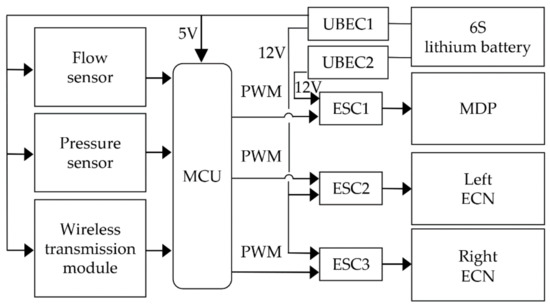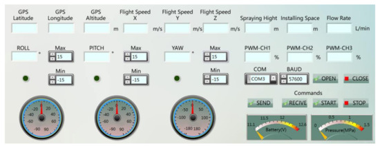 The control method of spraying system is shown in Figure 2. A microcontroller unit (MCU) with ARM Cortex-M4 kernel is used as the spraying controller. Two Ultra battery elimination circuit (UBEC) modules are deployed to stabilize the output voltage of the 6S lithium battery into constant 5 and 12 V, respectively. The 5 V powers the MCU, wireless data transmission module, pressure sensor, and flow sensor; the 12 V powers ECNs and MDP. The inputs of the MCU are connected to the flow sensor, pressure sensor and wireless data transmission module, and the outputs are connected to the MDP and ECN through three electronic speed controllers (ESCs). The MCU can output three independent PWM waves with adjustable duty cycle to control the rotational speed of the internal motors of the MDP and ECNs. The wireless data transmission module is used to build a direct communication bridge between the spray controller and the host computer. Based on LabVIEW, a control software running (as shown in Figure 3) on the host computer was developed to monitor the entire system and send control commands.