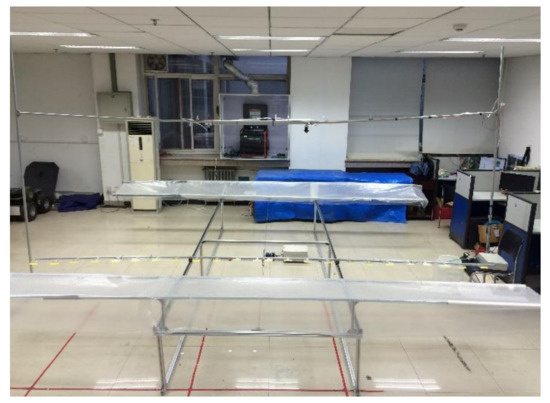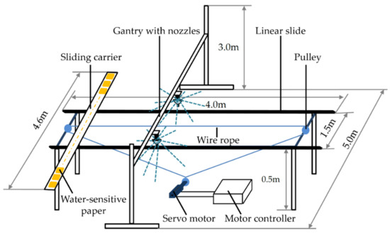 As shown in Figure 4, an indoor test platform was designed and constructed to study the effects of spraying height, flow rate, distance between nozzles, and PWM duty cycle on spraying performance of the proposed spraying system. The test platform is 4 m long, 5 m wide, and 3 m high. It is mainly composed of a gantry with nozzles, sliding carrier, liner slide, servo motor, motor controller, and pulleys. The servo motor drives the sliding carrier with water-sensitive paper (WSP) through the wire rope and pulleys to pass through the spraying field at 2.0 m/s. To avoid contamination of the WSP by droplets before the spraying field reaches a steady state, plastic film is used on both ends of the test platform to shield the sliding carrier.