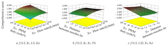 Considering the results of the single-factor test and the limitation of the actual operating environment, the level values of the four factors are configured as follows: spraying height X1: 1.0–2.0 m, flow rate X2: 0.50–2.00 L/min, distance between nozzles X3: 0.8–2.2 m, PWM duty cycle X4: 50–100%. The final four factors and three levels of the Box–Behnken tests are shown in Table 2.