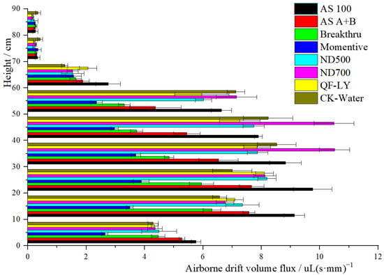 Comparing the drift distribution of spraying solutions at different heights, it can be seen that the AS 100 and ND 700 solutions had more airborne drift. When the height was below 30 cm, the drift of AS 100 solution increased with increasing vertical height, and the drift amount of it was the largest among these solutions. At the heights of 45 cm and 55 cm, the drift of the ND 700 solution was higher than that of the other solutions. In contrast, the Momentive solution showed the least drift, and its drift amount was much lower than the other solutions when the height was below 60 cm.