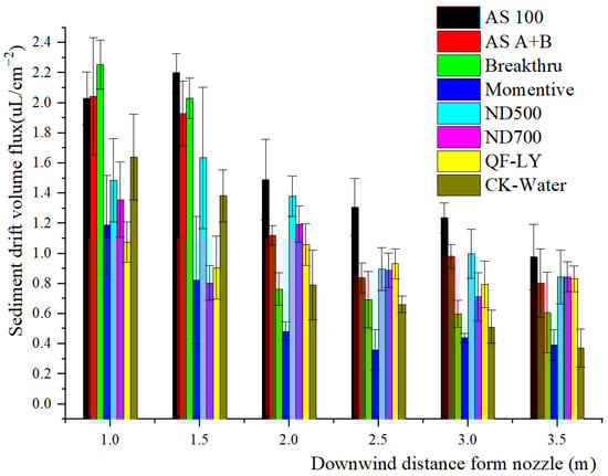 where is the volume flux at any point of the measuring plane, T is the total volume flux over the drifting spray profile, TN is nozzle output, V is the relative drift potential volume, h is the characteristic height of the drift potential cloud, hSt is the characteristic height of the drift potential cloud of the reference liquid (without adjuvants), and VSt is the relative drift potential volume of the reference liquid. In Equation (6), parameters a and b were known from a regression analysis with wind tunnel and field measurement for a lot of nozzles, and the best fit was a = 0.88 and b = 0.778, respectively [24]. The characteristic distances and DIXs of sediment drift were calculated in the same way.