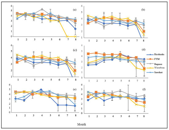 The present study also investigated the viability and stability of rhizobacterial biofertilizers that were formulated from the five different carrier materials (WB, SD, FYM, RH, and BG) for 8 months (February–September 2019) under refrigeration (8 °C) and room storage (25 ± 2 °C). The results are displayed in Figure 2a–f. The determination of shelf lives of formulations is a crucial step during the development of biofertilizers [8,39], and the prolonged survival of inoculants during storage is a desirable feature that can enhance the industrial applicability of biofertilizer formulations [8].