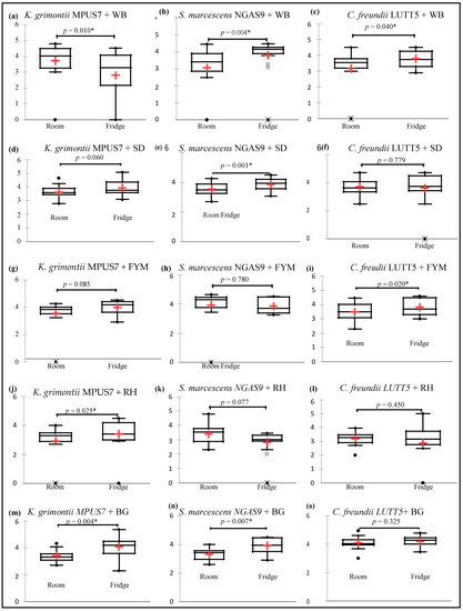 Unlike S. marcescens NGAS9 (Figure 3b) and C. freundii LUTT5 (Figure 3c), the number of viable cells of K. grimontii MPUS7 in the WB formulation was significantly higher under room storage (3.7 ± 1.1 log CFU g−1) than refrigerated conditions (2.8 ± 1.7 log CFU g−1) (Figure 3a). Similar observations were also made for S. marcescens in FYM (Figure 3h) and RH (Figure 3k). These results demonstrate that these formulations can easily be integrated into existing agricultural distribution systems that lack refrigeration facilities [44].