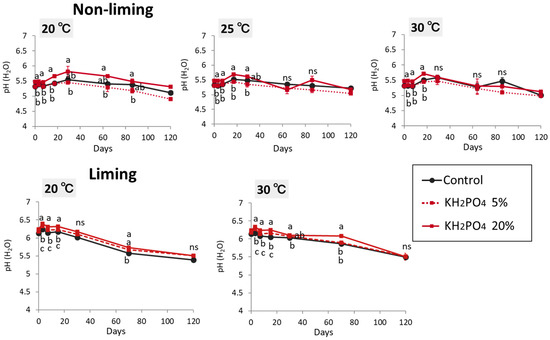 Figure 1. Change of soil pH (H2O) during the incubation period. Vertical bars indicate the standard error of means (n = 3). Different letters indicate significantly different on the same day (Tukey’s multiple comparison test, ns; not significantly different). The data on day 120 in non-liming treatment were not replicated, and therefore the statistical analyses were not performed.