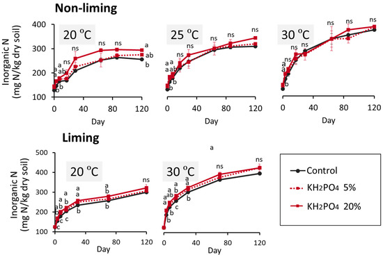 Figure 5. Change of mineral N in soils at different incubation treatments and temperatures. Vertical bars indicate the standard error of means (n = 3). Different letters indicate significant difference at each temperature (Tukey’s multiple comparison test; ns, not significantly different).