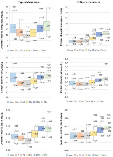 The content of mobile compounds of manganese in the Ap horizon of the typical chernozem was four times higher than that in ordinary chernozem, while the contents of mobile compounds of zinc and cobalt did not differ significantly. In the typical chernozem, the contents of mobile compounds of manganese and zinc in the Ap and CCa horizons did not differ significantly, and the content of mobile cobalt was significantly higher in the parent material. The contents of mobile compounds of manganese, zinc, and cobalt in the CCa horizon were significantly higher than those in the Ap horizon (Figure 3).