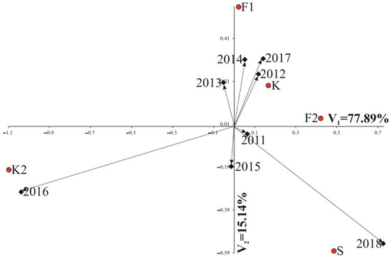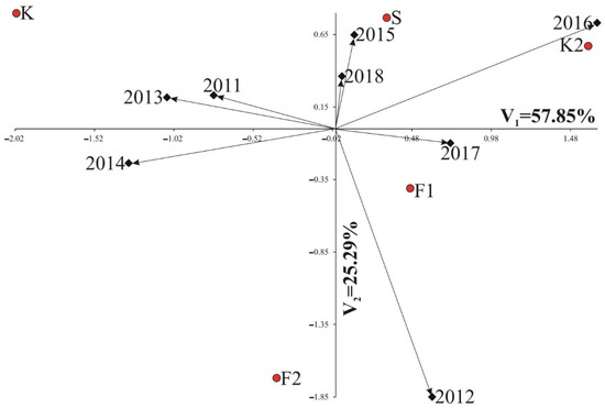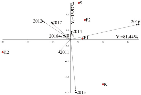 Biplot for protective treatments by years interaction of α-amino-nitrogen in the protective treatments in eight years, showing the effects of the first and second components (IPCA 1 and IPCA 2, respectively). F1—phenology based on the calculated sums of effective temperatures; F2—phenology based on the calculated sums of heat sums (F2); K—no pest control plot; K2—control plot sprayed with water; S—pest alert/the first adult insects (moths) captured in traps/signs of caterpillar feeding; IPCA—interactive principal component analysis.