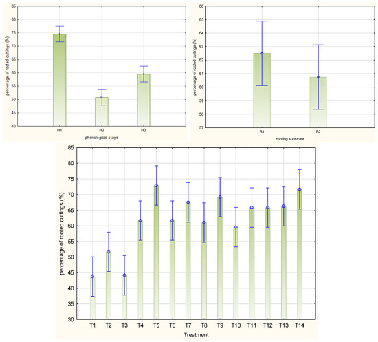 Rooting percentage in Rosa ‘Hurdal’ cuttings prepared from three phenological stages (H1–H3) of shoots and rooted in two rooting substrates after treatment by rooting enhancers. B1—peat–perlite; B2—peat–sand; H1—flower buds closed (BBCH 54,504; flower buds still closed); H2—flowers opened (69,605; full flowering, at least 50% of flowers open); H3—immediately after petal shedding (69,629; end of flowering of second order stem: all petals fallen); and treated: T1—the control cuttings; T2—0.4% IBA (Ukorzeniacz Aaqua); T3—0.2% NAA (Ukorzeniacz Baqua); T4, T5, T6, T7, T8, T9—Algae Extract: watering with 0.4% or 0.6% Bio Rhizotonic (10 mL) 1, 2, or 3 times (after planting and 10 and 20 days later); T10, T11, T12—Organic Preparation—watering with 0.1%, 0.2%, or 0.4% Root Juice™ (10 mL) after planting; T13, T14—Plant Extract—watering with 0.012% or 0.02% Bio Roots (10 mL) after planting. Vertical bars denote 95% confidence intervals for the mean of counts (one-way ANOVA).