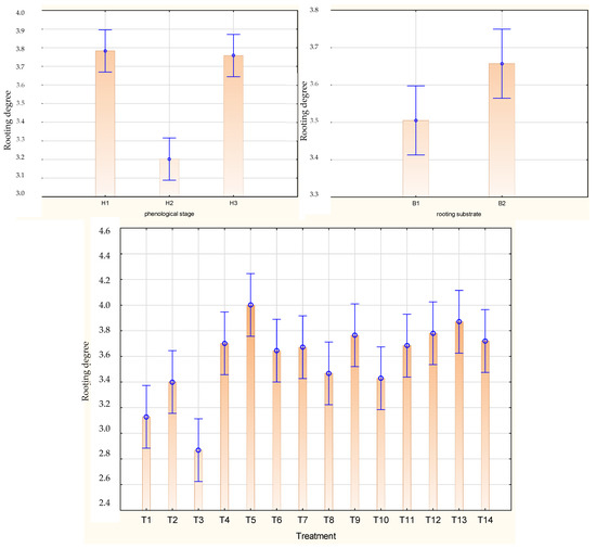 Percentage of cuttings with retained stock plant leaf in Rosa ‘Hurdal’ cuttings prepared from three phenological stages (H1–H3) of shoots and rooted in two rooting substrates after treatment by rooting enhancers. B1—peat–perlite; B2—peat–sand; H1—flower buds closed (BBCH 54,504; flower buds still closed); H2—flowers opened (69,605; full flowering, at least 50% of flowers open); H3—immediately after petal shedding (69,629; end of flowering of second order stem: all petals fallen); and treated: T1—the control cuttings; T2—0.4% IBA (Ukorzeniacz Aaqua); T3—0.2% NAA (Ukorzeniacz Baqua); T4, T5, T6, T7, T8, T9—Algae Extract: watering with 0.4% or 0.6% Bio Rhizotonic (10 mL) 1, 2, or 3 times (after planting and 10 and 20 days later); T10, T11, T12—Organic Preparation—watering with 0.1%, 0.2%, or 0.4% Root Juice™ (10 mL) after planting; T13, T14—Plant Extract—watering with 0.012% or 0.02% Bio Roots (10 mL) after planting. The degree of rooting on a 5-point scale: 1—only a callus, without formed roots; 2—at least one short root; 3—a few longer roots; 4—roots visibly developed, differentiated by the length; 5—strong roots starting to form a root ball, well developed. Vertical bars denote 95% confidence intervals for the mean of counts (one-way ANOVA).