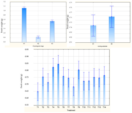 Fresh weight of Rosa ‘Hurdal’ cuttings prepared from three phenological stages (H1–H3) of shoots and rooted in two rooting substrates after treatment by rooting enhancers. B1—peat–perlite; B2—peat–sand; H1—flower buds closed (BBCH 54,504; flower buds still closed); H2—flowers opened (69,605; full flowering, at least 50% of flowers open); H3—immediately after petal shedding (69,629; end of flowering of second order stem: all petals fallen); and treated: T1—the control cuttings; T2—0.4% IBA (Ukorzeniacz Aaqua); T3—0.2% NAA (Ukorzeniacz Baqua); T4, T5, T6, T7, T8, T9—Algae Extract: watering with 0.4% or 0.6% Bio Rhizotonic (10 mL) 1, 2, or 3 times (after planting and 10 and 20 days later); T10, T11, T12—Organic Preparation—watering with 0.1%, 0.2%, or 0.4% Root Juice™ (10 mL) after planting; T13, T14—Plant Extract—watering with 0.012% or 0.02% Bio Roots (10 mL) after planting. The degree of rooting on a 5-point scale: 1—only a callus, without formed roots; 2—at least one short root; 3—a few longer roots; 4—roots visibly developed, differentiated by the length; 5—strong roots starting to form a root ball, well developed. Vertical bars denote 95% confidence intervals for the mean of counts (one-way ANOVA).