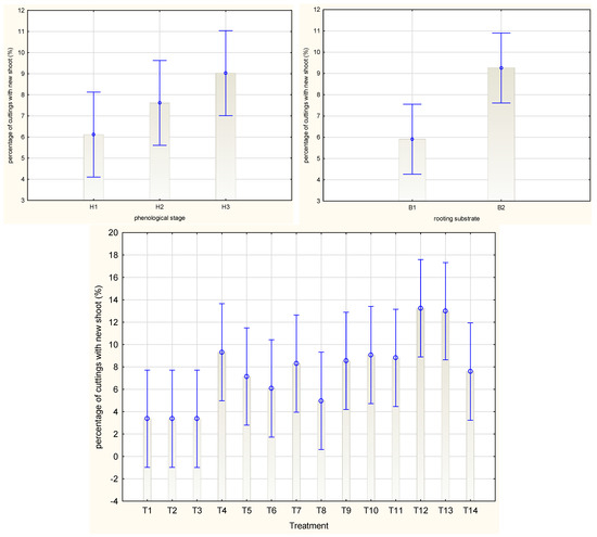 The percentage of cuttings with new shoots was highest by the use of 0.2% Organic Preparation in the case of H1 cuttings and after the single use of 0.6% Algae Extract and rooting in peat–sand for H2 and H3. The rooting substrate did not affect this mean for H1 and H3 cuttings, while for H2 cuttings it was higher in peat–sand (Figure S5).