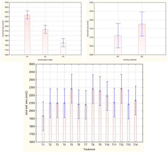 Total leaf area (mm2) in Rosa ‘Hurdal’ cuttings prepared from three phenological stages (H1–H3) of shoots and rooted in two rooting substrates after treatment by rooting enhancers. B1—peat–perlite; B2—peat–sand; H1—flower buds closed (BBCH 54,504; flower buds still closed); H2—flowers opened (69,605; full flowering, at least 50% of flowers open); H3—immediately after petal shedding (69,629; end of flowering of second order stem: all petals fallen); and treated: T1—the control cuttings; T2—0.4% IBA (Ukorzeniacz Aaqua); T3—0.2% NAA (Ukorzeniacz Baqua); T4, T5, T6, T7, T8, T9—Algae Extract: watering with 0.4% or 0.6% Bio Rhizotonic (10 mL) 1, 2, or 3 times (after planting and 10 and 20 days later); T10, T11, T12—Organic Preparation—watering with 0.1%, 0.2%, or 0.4% Root Juice™ (10 mL) after planting; T13, T14—Plant Extract—watering with 0.012% or 0.02% Bio Roots (10 mL) after planting. The degree of rooting on a 5-point scale: 1—only a callus, without formed roots; 2—at least one short root; 3—a few longer roots; 4—roots visibly developed, differentiated by the length; 5—strong roots starting to form a root ball, well developed. Vertical bars denote 95% confidence intervals for the mean of counts (one-way ANOVA).