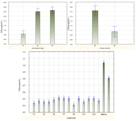 Content of chlorophyll a (mg·g−1 FW) in leaves of Rosa ‘Hurdal’ cuttings prepared from three phenological stages (H1–H3) of shoots and rooted in two rooting substrates after treatment by rooting enhancers. B1—peat–perlite; B2—peat–sand; H1—flower buds closed (BBCH 54,504; flower buds still closed); H2—flowers opened (69,605; full flowering, at least 50% of flowers open); H3—immediately after petal shedding (69,629; end of flowering of second order stem: all petals fallen); and treated: T1—the control cuttings; T2—0.4% IBA (Ukorzeniacz Aaqua); T3—0.2% NAA (Ukorzeniacz Baqua); T4, T5, T6, T7, T8, T9—Algae Extract: watering with 0.4% or 0.6% Bio Rhizotonic (10 mL) 1, 2, or 3 times (after planting and 10 and 20 days later); T10, T11, T12—Organic Preparation—watering with 0.1%, 0.2%, or 0.4% Root Juice™ (10 mL) after planting; T13, T14—Plant Extract—watering with 0.012% or 0.02% Bio Roots (10 mL) after planting. The degree of rooting on a 5-point scale: 1—only a callus, without formed roots; 2—at least one short root; 3—a few longer roots; 4—roots visibly developed, differentiated by the length; 5—strong roots starting to form a root ball, well developed. Vertical bars denote 95% confidence intervals for the mean of counts (one-way ANOVA).