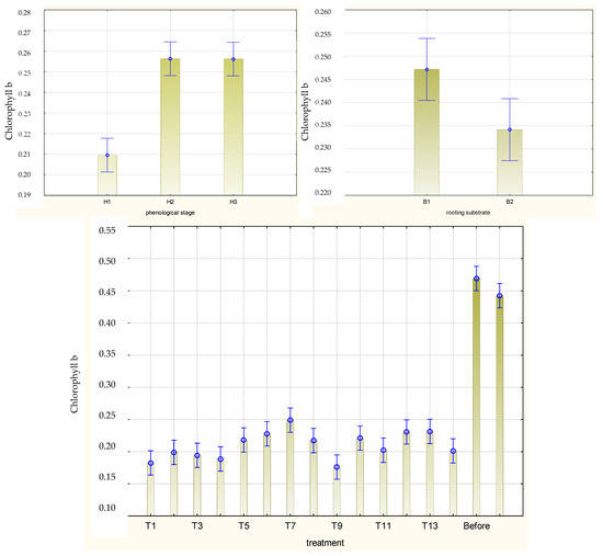 Content of chlorophyll b (mg·g−1 FW) in leaves of Rosa ‘Hurdal’ cuttings prepared from three phenological stages (H1–H3) of shoots and rooted in two rooting substrates after treatment by rooting enhancers. B1—peat–perlite; B2—peat–sand; H1—flower buds closed (BBCH 54,504; flower buds still closed); H2—flowers opened (69,605; full flowering, at least 50% of flowers open); H3—immediately after petal shedding (69,629; end of flowering of second order stem: all petals fallen); and treated: T1—the control cuttings; T2—0.4% IBA (Ukorzeniacz Aaqua); T3—0.2% NAA (Ukorzeniacz Baqua); T4, T5, T6, T7, T8, T9—Algae Extract: watering with 0.4% or 0.6% Bio Rhizotonic (10 mL) 1, 2, or 3 times (after planting and 10 and 20 days later); T10, T11, T12—Organic Preparation—watering with 0.1%, 0.2%, or 0.4% Root Juice™ (10 mL) after planting; T13, T14—Plant Extract—watering with 0.012% or 0.02% Bio Roots (10 mL) after planting. The degree of rooting on a 5-point scale: 1—only a callus, without formed roots; 2—at least one short root; 3—a few longer roots; 4—roots visibly developed, differentiated by the length; 5—strong roots starting to form a root ball, well developed. Vertical bars denote 95% confidence intervals for the mean of counts (one-way ANOVA).