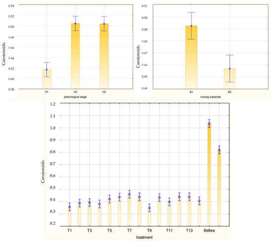 Content of carotenoids (mg·g−1 FW) in leaves of Rosa ‘Hurdal’ cuttings prepared from three phenological stages (H1–H3) of shoots and rooted in two rooting substrates after treatment by rooting enhancers. B1—peat–perlite; B2—peat–sand; H1—flower buds closed (BBCH 54,504; flower buds still closed); H2—flowers opened (69,605; full flowering, at least 50% of flowers open); H3—immediately after petal shedding (69,629; end of flowering of second order stem: all petals fallen); and treated: T1—the control cuttings; T2—0.4% IBA (Ukorzeniacz Aaqua); T3—0.2% NAA (Ukorzeniacz Baqua); T4, T5, T6, T7, T8, T9—Algae Extract: watering with 0.4% or 0.6% Bio Rhizotonic (10 mL) 1, 2, or 3 times (after planting and 10 and 20 days later); T10, T11, T12—Organic Preparation—watering with 0.1%, 0.2%, or 0.4% Root Juice™ (10 mL) after planting; T13, T14—Plant Extract—watering with 0.012% or 0.02% Bio Roots (10 mL) after planting. The degree of rooting on a 5-point scale: 1—only a callus, without formed roots; 2—at least one short root; 3—a few longer roots; 4—roots visibly developed, differentiated by the length; 5—strong roots starting to form a root ball, well developed. Vertical bars denote 95% confidence intervals for the mean of counts (one-way ANOVA).