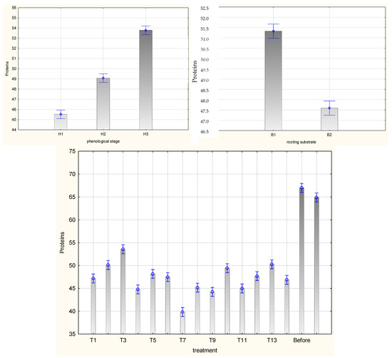 Content of soluble proteins (μg·mg−1 FW) in leaves of Rosa ‘Hurdal’ cuttings prepared from three phenological stages (H1–H3) of shoots and rooted in two rooting substrates after treatment by rooting enhancers. B1—peat–perlite; B2—peat–sand; H1—flower buds closed (BBCH 54,504; flower buds still closed); H2—flowers opened (69,605; full flowering, at least 50% of flowers open); H3—immediately after petal shedding (69,629; end of flowering of second order stem: all petals fallen); and treated: T1—the control cuttings; T2—0.4% IBA (Ukorzeniacz Aaqua); T3—0.2% NAA (Ukorzeniacz Baqua); T4, T5, T6, T7, T8, T9—Algae Extract: watering with 0.4% or 0.6% Bio Rhizotonic (10 mL) 1, 2, or 3 times (after planting and 10 and 20 days later); T10, T11, T12—Organic Preparation—watering with 0.1%, 0.2%, or 0.4% Root Juice™ (10 mL) after planting; T13, T14—Plant Extract—watering with 0.012% or 0.02% Bio Roots (10 mL) after planting. The degree of rooting on a 5-point scale: 1—only a callus, without formed roots; 2—at least one short root; 3—a few longer roots; 4—roots visibly developed, differentiated by the length; 5—strong roots starting to form a root ball, well developed. Vertical bars denote 95% confidence intervals for the mean of counts (one-way ANOVA).