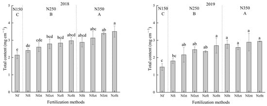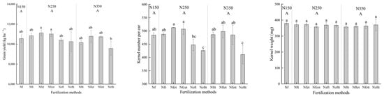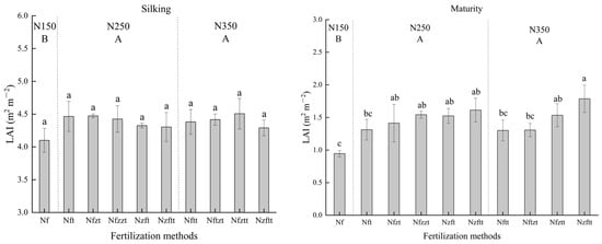 - Hou, Y.P.; Yang, J.; Yin, C.X.; Qin, Y.B.; Li, Q.; Yu, L.; Kong, L.L.; Liu, Z.Q. Effect of postponing nitrogen application on the yield, nitrogen absorption and utilization and soil nitrogen supply in spring maize. J. Maize Sci. 2019, 27, 146–154. [Google Scholar]