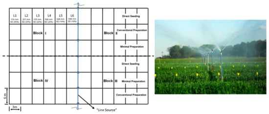 The experimental design was of randomized strips, with four repetitions (Figure 2). Our treatments consisted of three soil preparation methods: conventional with one plowing followed by two passes with a disc harrow with soil turning to ± 0.2 m (CP); minimal preparation with one pass using a seed bed conditioner turning approximately the top 0.1 m of soil (MP); and direct seeding (DS). DS was completed with a seeder equipped for 15 lines spaced 0.17 m apart and a seeding density of 350 seeds m−2, and the BRS-264 cultivar (non-transgenic). Fertilization at seeding consisted of 500 kg ha−1 of NPK 04-30-16 plus application of 10 kg ha−1 of FTE Borogran 10 (8% boron) to control the sterility of male grains. For fertilization after germination, 60 kg ha−1 of nitrogen (N) from urea (45-0-0) was applied using a tractor pulled spin spreader.