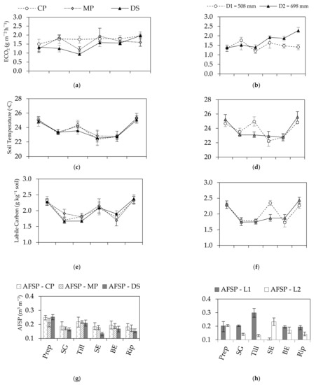 This variability of CO2 efflux between production systems with similar soil preparation methods reinforces the complexity of this phenomenon and highlights the importance of region and cultivation conditions. Despite their variability, the controlling variables of the production and emission process are dependent on temporary, local edaphoclimatic conditions [40]. There was no effect of soil preparation or irrigation depth on soil temperature or labile carbon. However, a significant effect was observed on air-filled soil pore space depending on soil preparation method. Specifically, increasing the intensity of soil preparation increased the soil air-filled pore space (CP > MP > DS). In this way, the increase in pore space opens pathways for greater gas exchange between the soil-atmosphere system, and leads to greater net losses of carbon from the soil via CO2 efflux. When separated by growth phase, there was no significant effect of soil preparation or irrigation depth on soil air-filled pore space (PPar) from 0 to 0.2 m (Figure 3a,b).