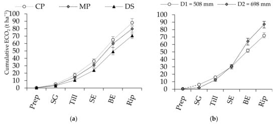 (a) Effect of Soil Preparation; (b) Effect of Irrigation Depth; (a,b) Cumulative CO2 efflux (Cumulative ECO2 (t ha−1)) across the stages of development of irrigated wheat with varying soil preparation methods and irrigation depths, Tangará da Serra, 2012; SG = Seedling Growth; Till = Tillering; ST = Stem Elongation; BE = Booting Emergence; Rip = Ripening.