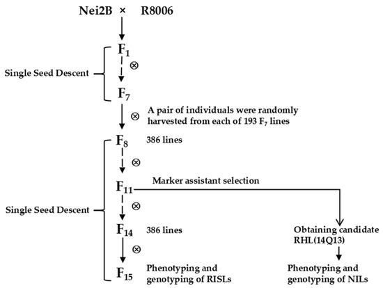 Nei2You No.6 is a high-yielding three-line hybrid indica variety bred by the China National Rice Research Institute (http://www.ricedata.cn/variety/superice.htm, accessed on 13 January 2022). The RISL population (F15) was developed from a cross between the maintainer Nei2B and the restorer Zhonghui8006 (R8006), consisting of 386 lines with 3203 Bin markers [16]. A total of 386 lines consisted of 193 pairs, with two randomly selected individuals as a pair in the F7 progeny. The genetic variation between the paired lines at the target interval allowed us to obtain residual heterozygous lines (RHLs) by tracing the previous generation (Figure 1). For QTL mapping, parental lines and RISLs were planted in Fuyang (FY, 119°57′ E, 30°03′ N), Zhejiang Province from 2015 to 2018. All trials were performed with a completely randomized block design with two replications. Approximately 25 days after germination, 16 plants from each line were transplanted into two rows with a spacing of 21 cm × 18 cm in early June. Field management followed conventional practices. At maturity, the plant height of six individuals from each RISL line was measured manually with a straightedge. For the NILs, at least eight individuals from the inner portion of each line were collected to evaluate their plant heights, heading dates, and yield traits. For the phenotype of the plant yield, sun-dried threshed seed was evaluated with an automatic seed examination system (Wanshen Detection Technology Co., Ltd., Hangzhou, China).